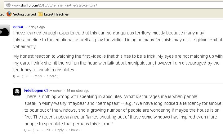 The bias is persistently male-negative. It is evasionary of any realization, or any frank admission, that women in the depth of their nature are just as rotten as men. You can almost hear the female-justification motor click into overdrive in the backs of feminist heads, any time the least shadow of womanly or girlish malfeasance confronts them. They are not a bit concerned to know what actually IS; rather, they fervently wish to know what, according to their template,