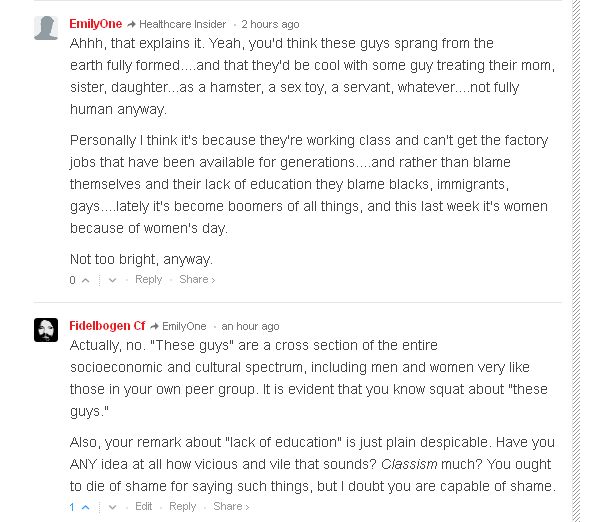 If in fact men are the problem as feminism supposes, and consequently that women are not, then it would follow that men specifically are under some manner of obligation which upon analysis would translate as a debt owed to women. And such indeed summarizes the general wind that has wafted from the direction of feminism and spread widely into other quarters. That is why I say that the feminists would take issue with the idea that male and female are political parties: because it implies that men and women are equal cutthroat gangs competing equally to cut each other's throats. The feminists would favor a scenario in which one of those gangs would bare its collective throat voluntarily to the gang wielding the knife.
